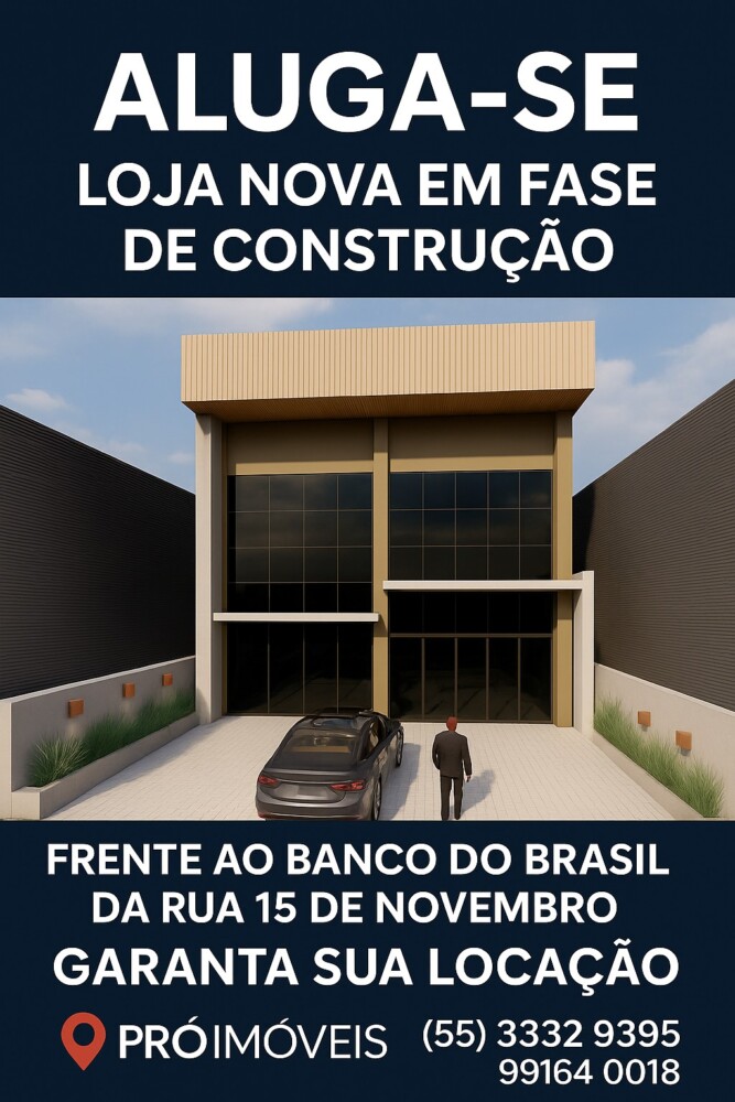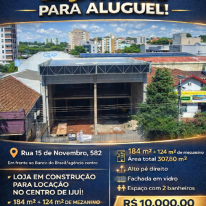 BELÍSSIMA LOJA EM CONSTRUÇÃO PARA LOCAÇÃO NO CENTRO DE IJUÍ! Será uma loja nova, com 184 m2 + 124 m2 de mezanino; área total de 307,80 m2. Com alto pé direito, 4 banheiros, fachada em vidro, estacionamento frontal. Excelente e privilegiada localização, na rua 15 de Novembro, 582, em frente ao Banco do Brasil/agência centro.